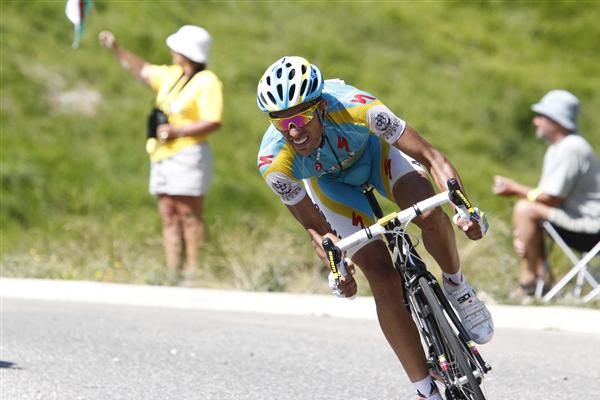 3. Back to the Port de Bales. Once Contador realized that Schleck had attacked—a second after Vinokourov responded—he closed the move as anyone contender would have: with force, exploding from the group with his head down. Clearly, it was Contador’s intention to blow right by the Saxo rider, a common move for anyone launching a counter-attack. (An important note: Contador did not attack, Schleck did—Contador simply countered.)