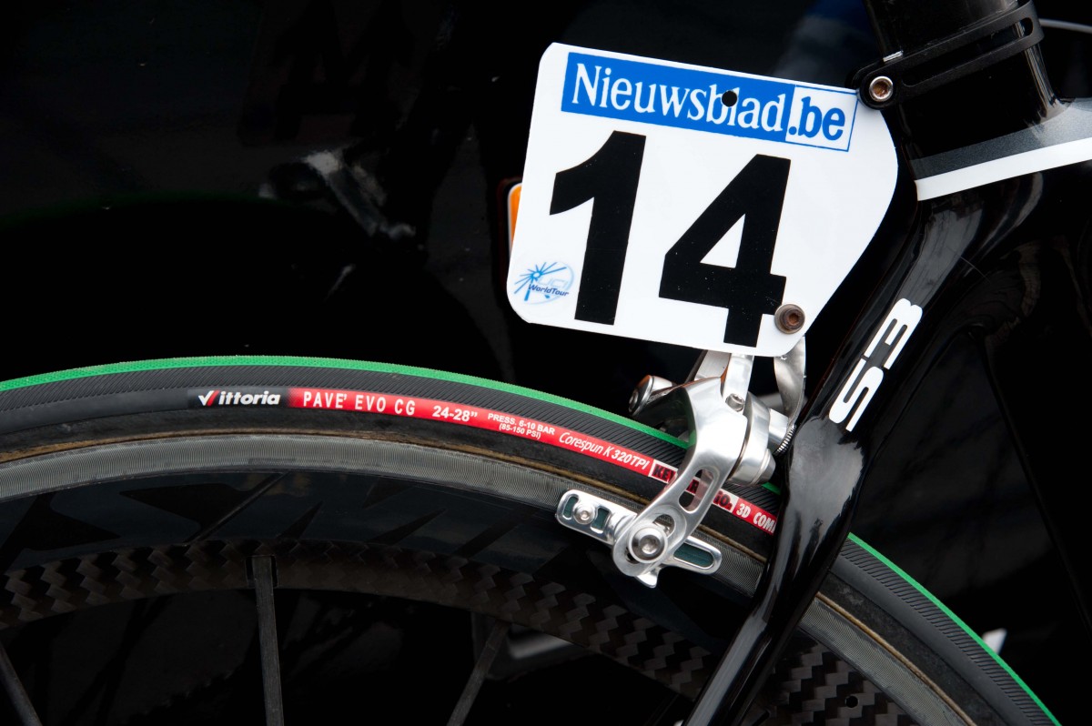The Vittoria Pavé is the go-to tire for most teams. The Pavé has evolved over the years – its grandparent was the Utmost, the tire of choice for pavé in the ’90s. For Flanders, teams ran the 24mm version.