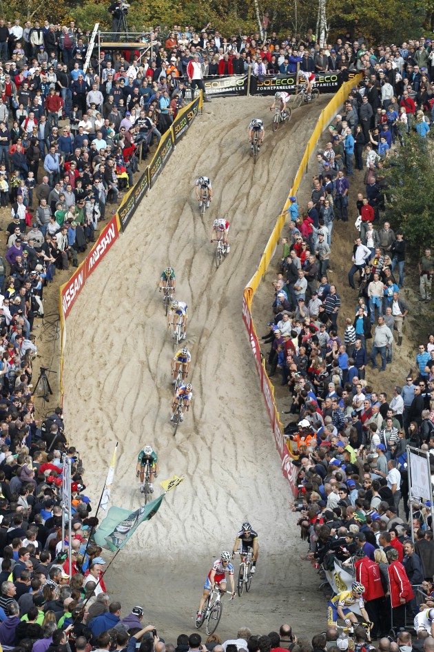 Conditions in Zonhoven were a clear challenge to the riders. Two features were immediately noticeable: a pair of precipitously steep descents through deeply-rutted sand, and the corresponding run-up. The descents caused many people problems – Tom Meeusen wasn’t the only rider to crash, going over his bars after losing his front wheel, but he managed to do so right in front of Bart Aernouts, who in his attempt to avoid Meeusen, launched himself over his bars and landed squarely on Meeusen’s bike. The run-up, meanwhile, was a steep, loose, long grind – by the end of the race, even the leading riders had difficulty running, and dragged themselves to the top with the aid of a few tugs on the course barriers. Conditions were so challenging that the top ten finishers were spread over 3 minutes, 29 seconds; only 23 riders finished on the first lap, and extremely capable riders like Steve Chainel and Jon Page were among those to get lapped.